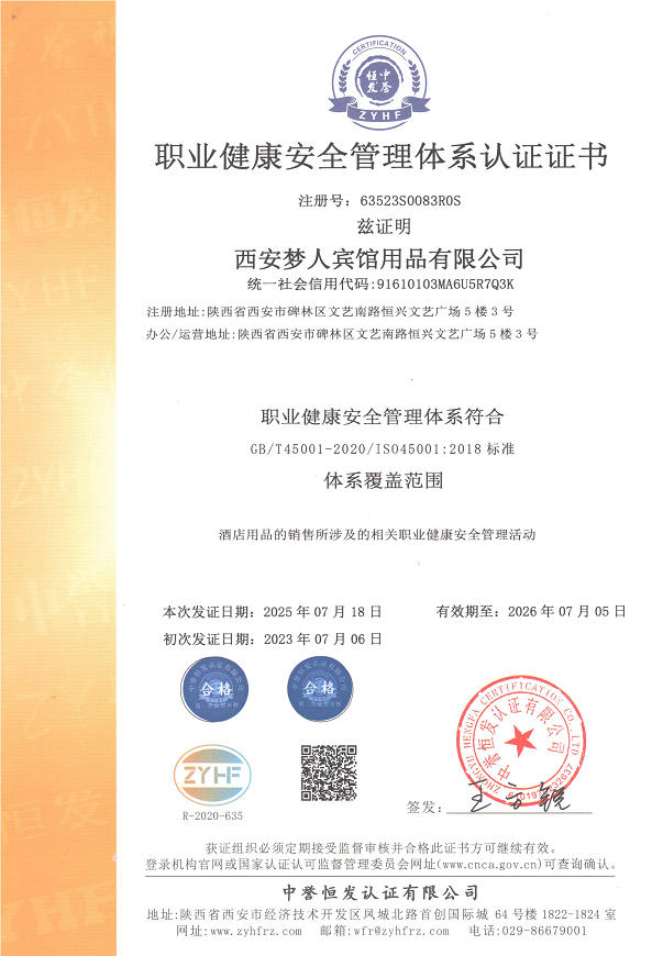 梦人宾馆用品有限公司是一家服务于星 级酒店的专业酒店用品服务商,“梦人”商标注册于1999年,历经20多年的发展,服务众多的星 级酒店,经验丰富,服务及时,通过了ISO9001质量管理体系认 证和ISO14001环境管理体系认 证,曾荣获“陕西省**商标”,“ 陕西省质量优 秀品牌企业”“陕西省重质量守信誉单位”等多项荣誉,公司本着“以信为本,以诚待人”的发展理念,着力打造优良的酒店用品服务商。